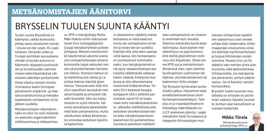 Jo aikaisemmin säädetty metsäkatoasetus ei vielä kaatunut, mutta sen voimaantuloa siirrettiin jo toisen kerran vuodella. Näyttää siltä, että sekin saattaa vielä kaatua. Sen toimeenpano on osoittautunut toimimattomaksi, kun tietojärjestelmät eivät pysty vastaanottamaan asetuksella säädettävää valtavaa tiedon määrää. Esitetyssä muodossa se olisi aiheuttamassa massiivista lisäbyrokratiaa. Toiseksi EU:n keskeiset kauppakumppanit USA:n johdolla painostavat rajusti EU:ta luopumaan koko metsäkatoasetuksesta. Jatkoaika mahdollistaa joko asetuksen yksinkertaistamisen tai koko metsäkatoasetuksen kaatamisen EU parlamentissa. Suomessa asetuksen mahdolliseen voimaantuloon on investoitu enemmän kuin muualla. Olemme mestareita byrokratian hallinnassa. Suomalainen metsäteollisuus on jopa katsonut, että meillä järjestelmien toimivuus olisi kilpailuetu. Siihen emme MTK:ssa ja metsänhoitoyhdistyksissä usko, vaan otamme byrokraattisen uudistuksen lykkäyksen, yksinkertaistamisen tai kaatumisen ilolla vastaan.