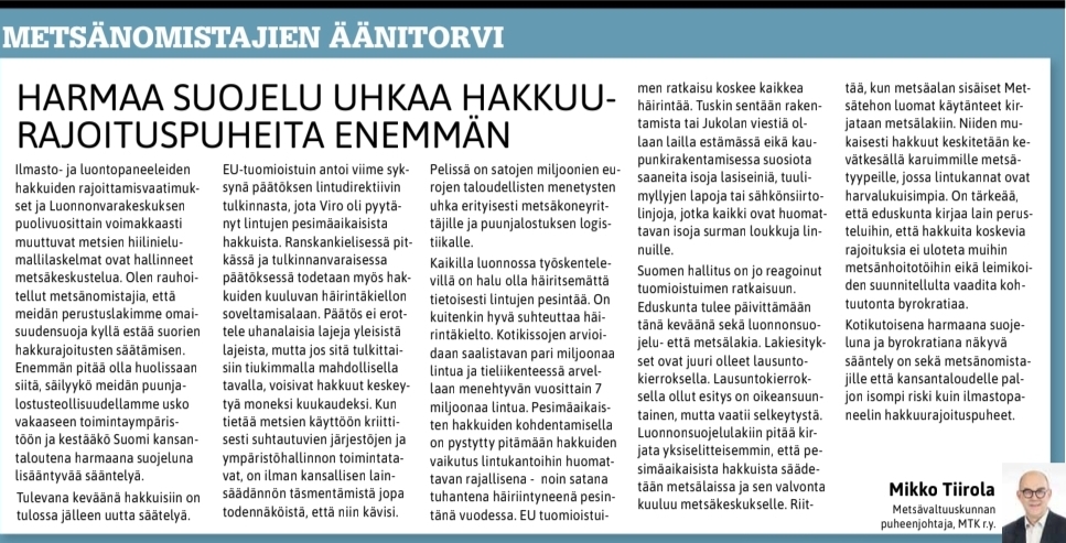 Tulevana keväänä hakkuisiin on tulossa jälleen uutta säätelyä. EU-tuomioistuin antoi viime syksynä päätöksen lintudirektiivin tulkinnasta, jota Viro oli pyytänyt lintujen pesimäaikaisista hakkuista. Ranskankielisessä pitkässä ja tulkinnanvaraisessa päätöksessä todetaan myös hakkuiden kuuluvan häirintäkiellon soveltamisalaan. Päätös ei erottele uhanalaisia lajeja yleisistä lajeista, mutta jos sitä tulkittaisiin tiukimmalla mahdollisella tavalla, voisivat hakkuut keskeytyä moneksi kuukaudeksi. Kun tietää metsien käyttöön kriittisesti suhtautuvien järjestöjen ja ympäristöhallinnon toimintatavat, on ilman kansallisen lainsäädännön täsmentämistä jopa todennäköistä, että niin kävisi. Pelissä on satojen miljoonien eurojen taloudellisten menetysten uhka erityisesti metsäkoneyrittäjille ja puunjalostuksen logistiikalle.