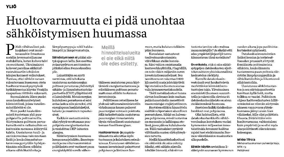 Lisääntyvä sähköriippuvuus ja muun muassa puuenergian käyttöön kohdistuvat paineet ovat Suomelle riski, kirjoittaa MTK:n metsävaltuuskunnan puheenjohtaja Mikko Tiirola. "Poliittinen ohjaus haittavaikutusten hillitsemiseksi on vihreän siirtymän nimeen vannovassa yhteiskunnassa jäänyt aivan liian vähäiseksi."