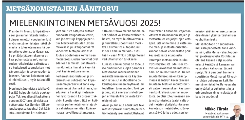 Presidentti Trump tullipäätöksineen ja rauhanrakentamistouhuineen on ollut vuoden henkilö myös metsänomistajan näkökulmasta ja tulee olemaan sitä uutenakin vuotena. Jos Gazan rauha pitää ja jälleenrakennus alkaa, puhumattakaan Ukrainan sodan ratkaisuista, vaikuttavat ne keskeisesti suomalaisen metsänomistajan tulevan vuoden tulokseen. Rauhaa...